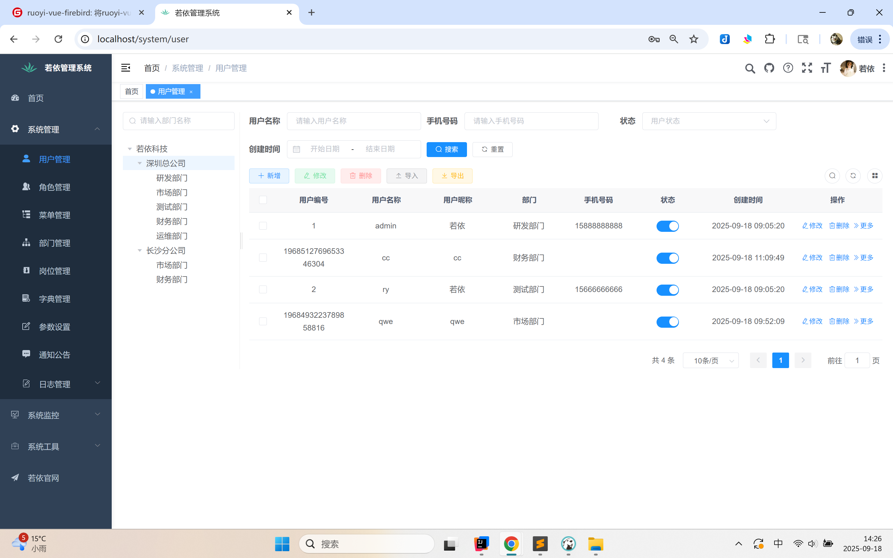 2. 部门管理:配置系统组织机构(公司、部门、小组),树结构展现支持数据权限。