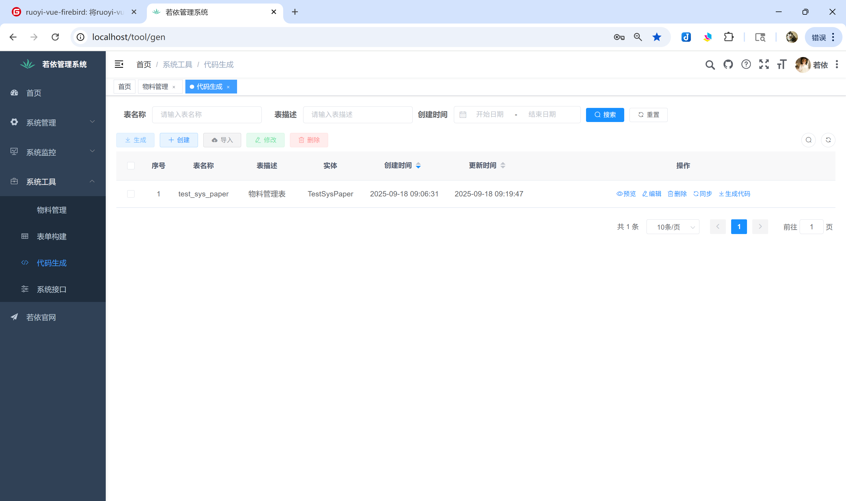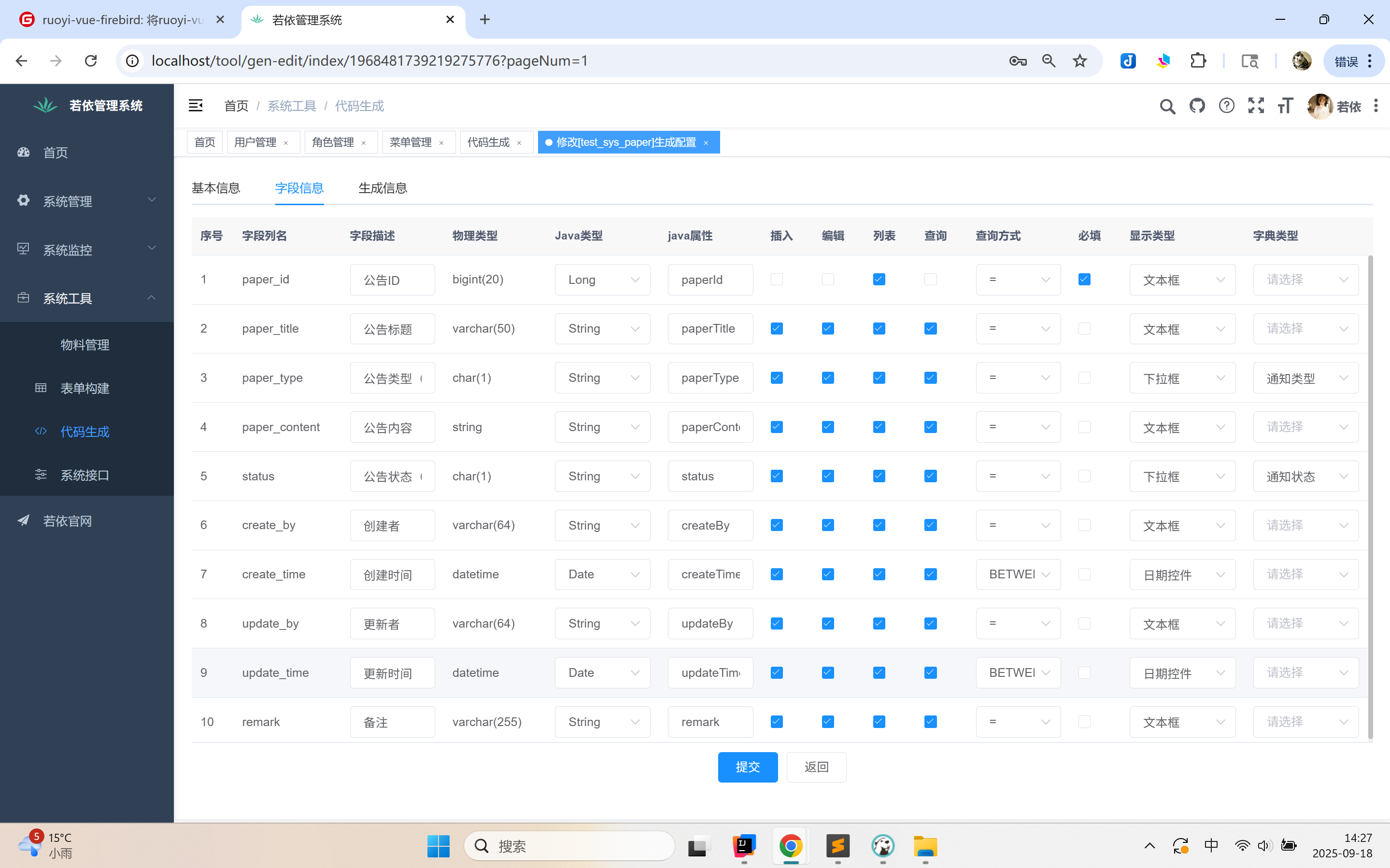 6. 代码生成:前后端代码的生成(java、html、xml、sql)支持CRUD下载