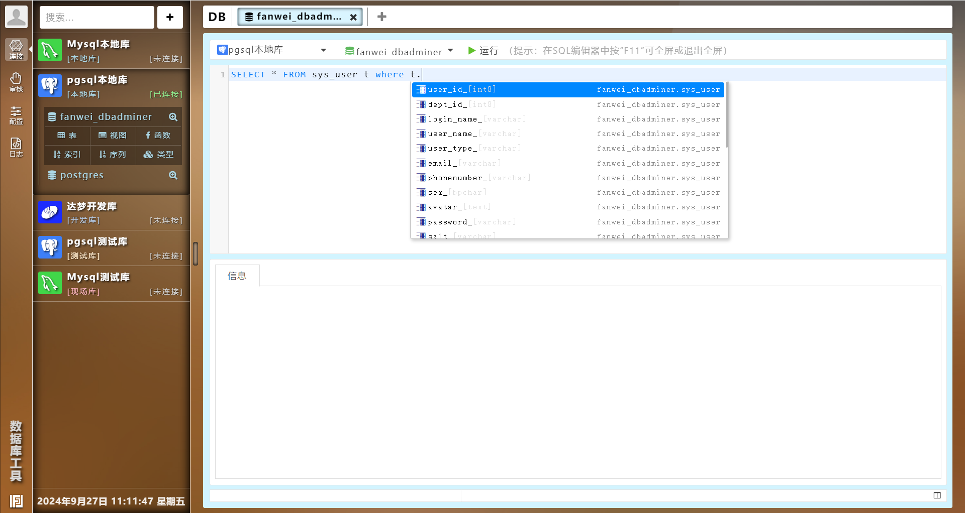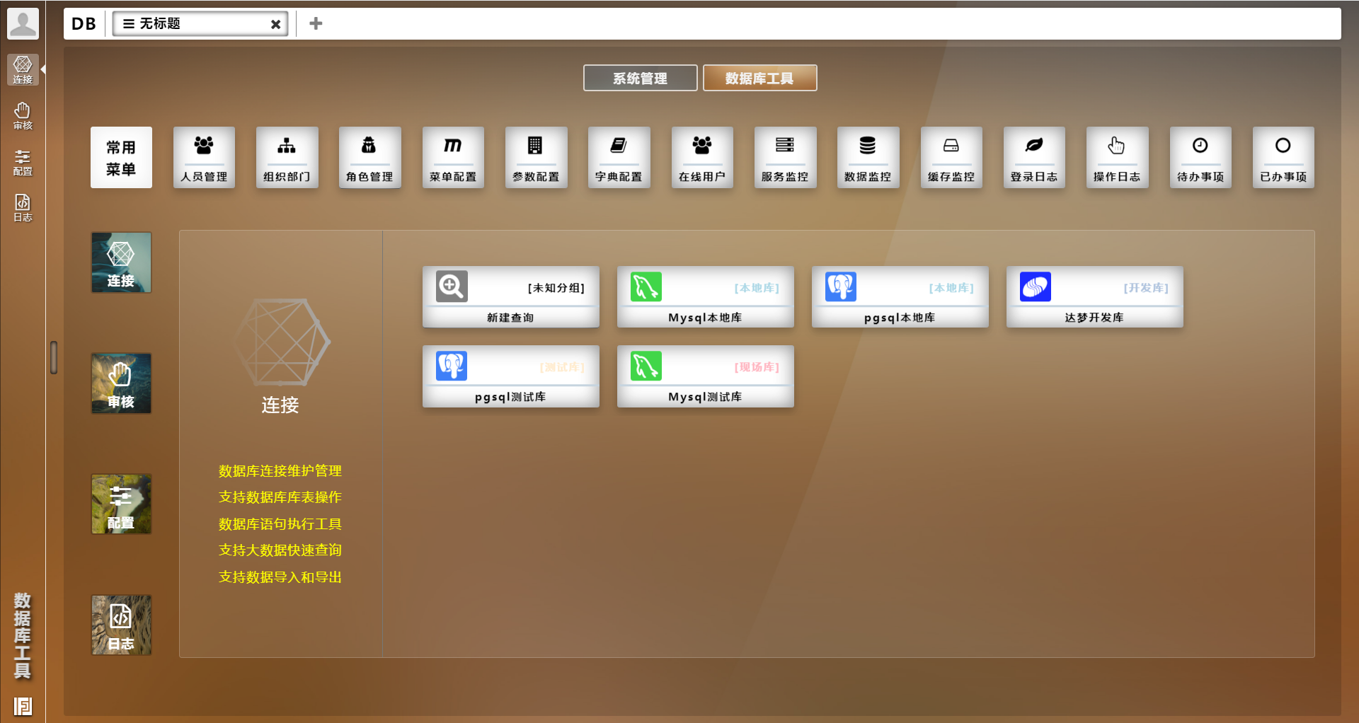 - 连接管理:配置连接数据库;数据库表、视图、索引等信息查看;数据库执行操作等。