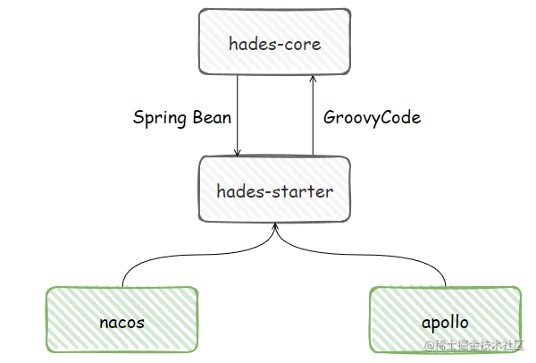 ### hades 介绍 项目背景:业务开发逻辑变更频繁,一点小的修改都要发布系统,灵活度不够。对于一些**非核心流程又频繁改动**的部分是否可以用动态脚本替代? 核心功能:**Java应用无须发布上下线,即可动态变更业务逻辑** ### hades 技术原理 核心技术:Groovy+分布式配置中心(`apollo`/`nacos`)  技术原理:将`Groovy`脚本写在配置中心里,借助分布式配置中心监听配置功能,客户端能实时发现`Groovy`脚本变更。`hades`规则引擎将`Groovy`脚本解析后,放入`Spring IOC`容器中供客户端使用。 ### hades 使用手册 1、引入maven依赖: ```xml