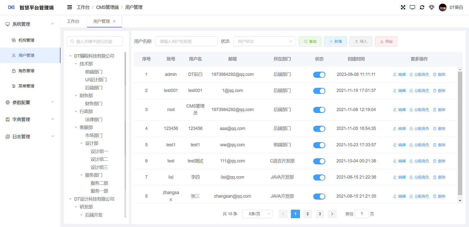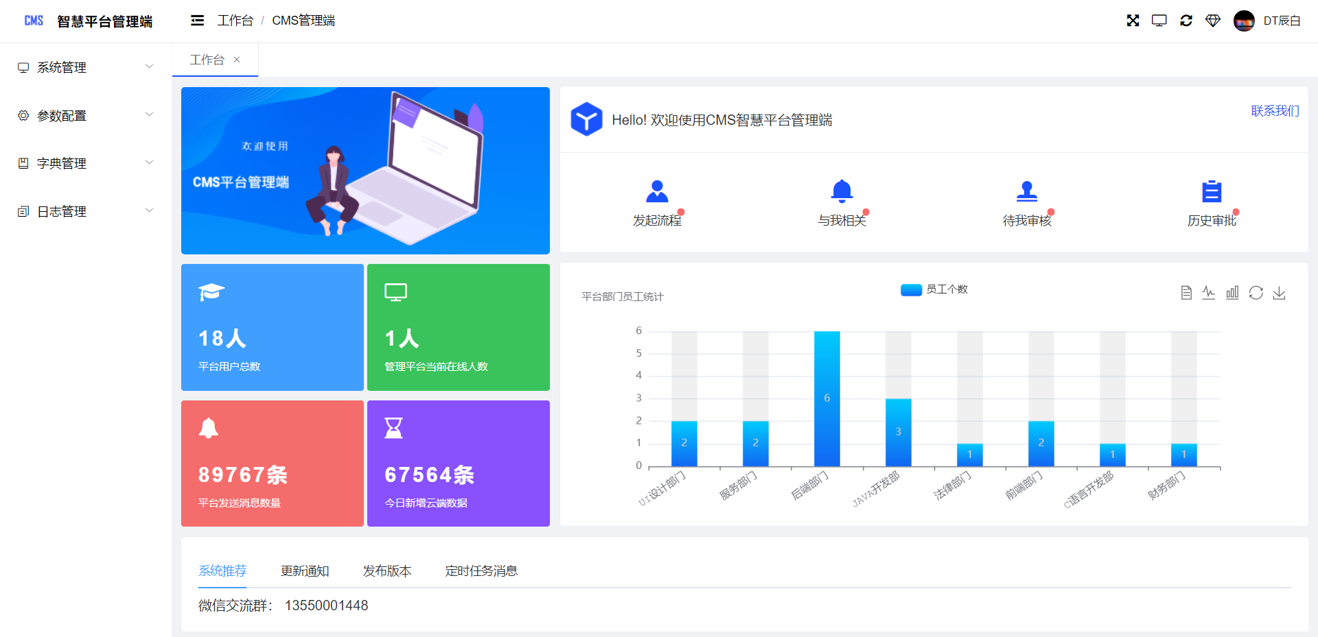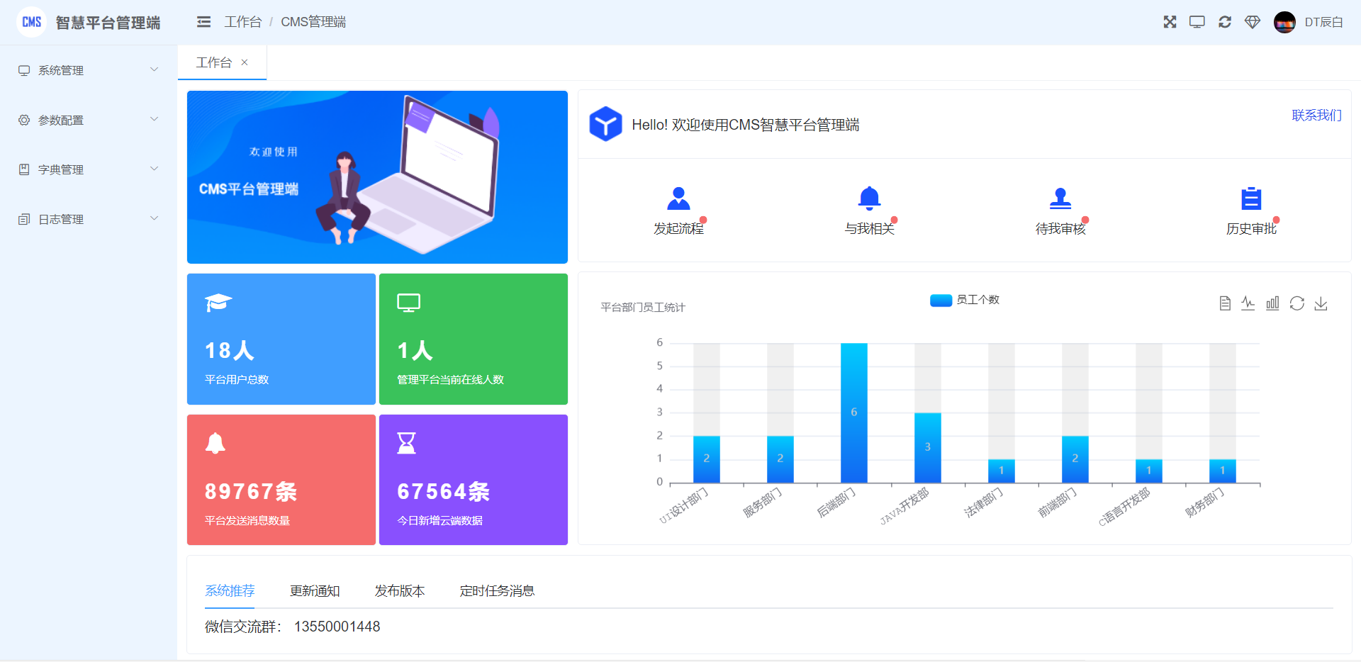 **DT CMS** 是一款SpringBoot2.x与Vue整合前后端分离内容管理系统,项目源码完全由个人精心编写,致力于做更简洁高性能RBAC内容服务系统,追求 **快速的用户体验** 、 **二次编码** ,以及 **核心技术模块的整合** 使用。后端新技术框架的加持、前端UI的设计与美化,会持续升级,持续完善,欢迎亲友们收藏、点赞和转发。