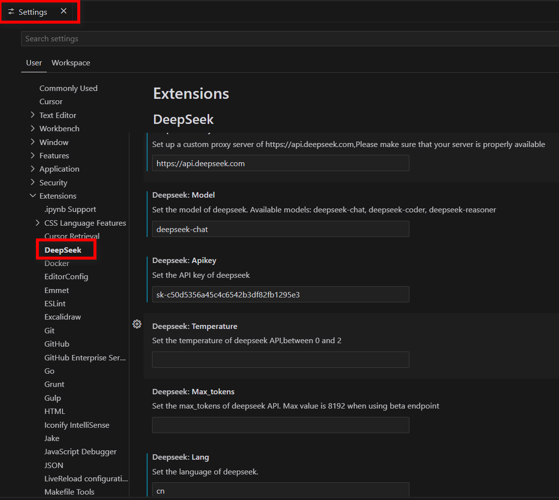 1. Click File->Preferences->Settings->Extensions->DeepSeek