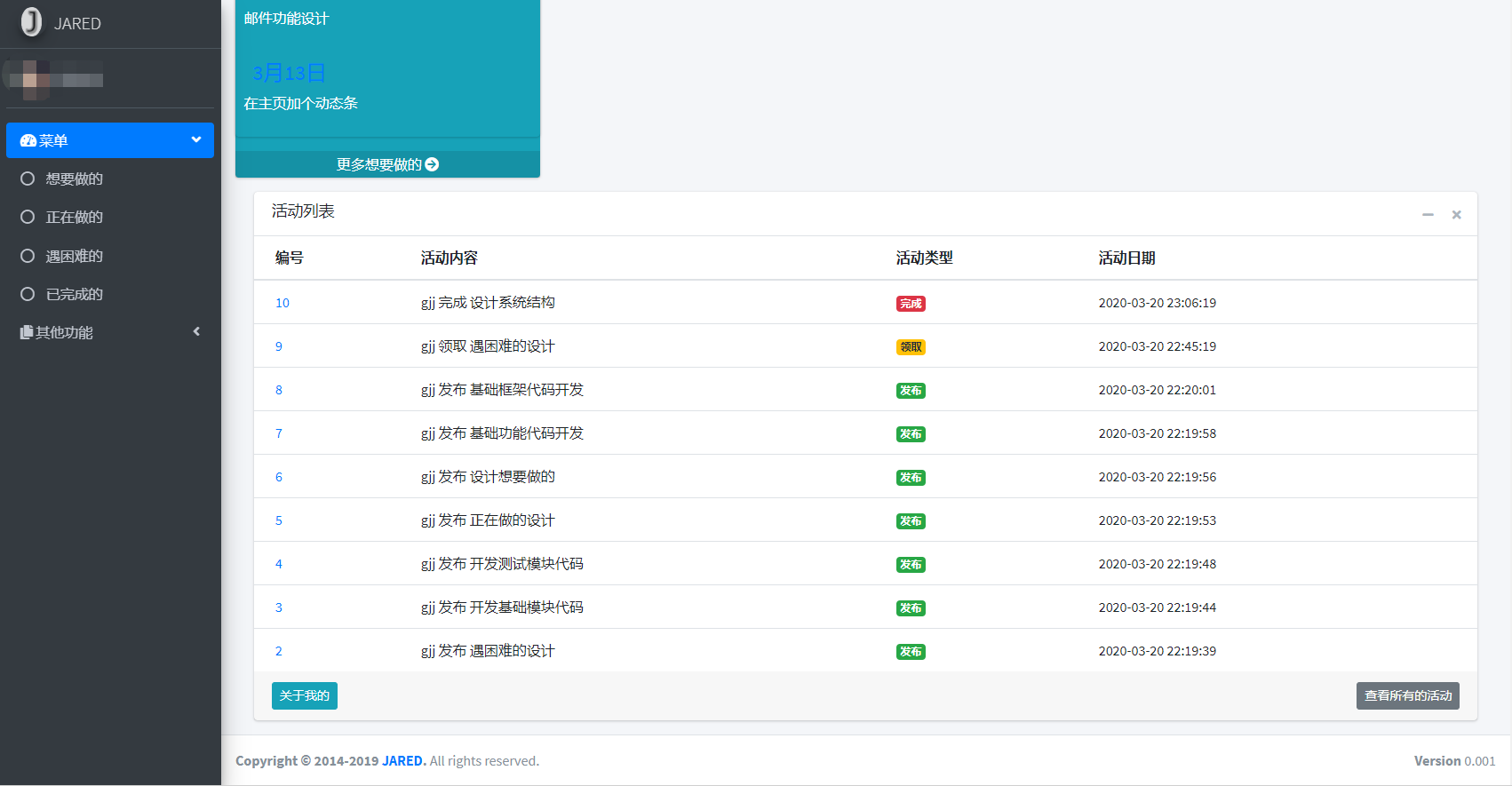 - **Description**: 看过硅谷吗,里面有个高高的白白的挺搞笑的叫贾瑞德,他提出软件开发四步,想要做的,正在做的,遇困难的,和已完成的。我这个软件就是基于这四步。