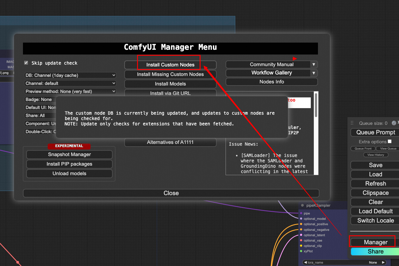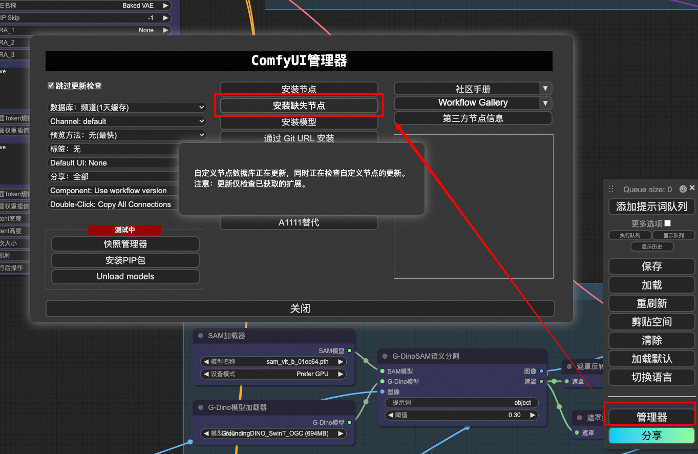 导入第三方的工作流,可能会遇到节点不存在的报错,可以借助 ComfyUI Manager 安装缺失的节点