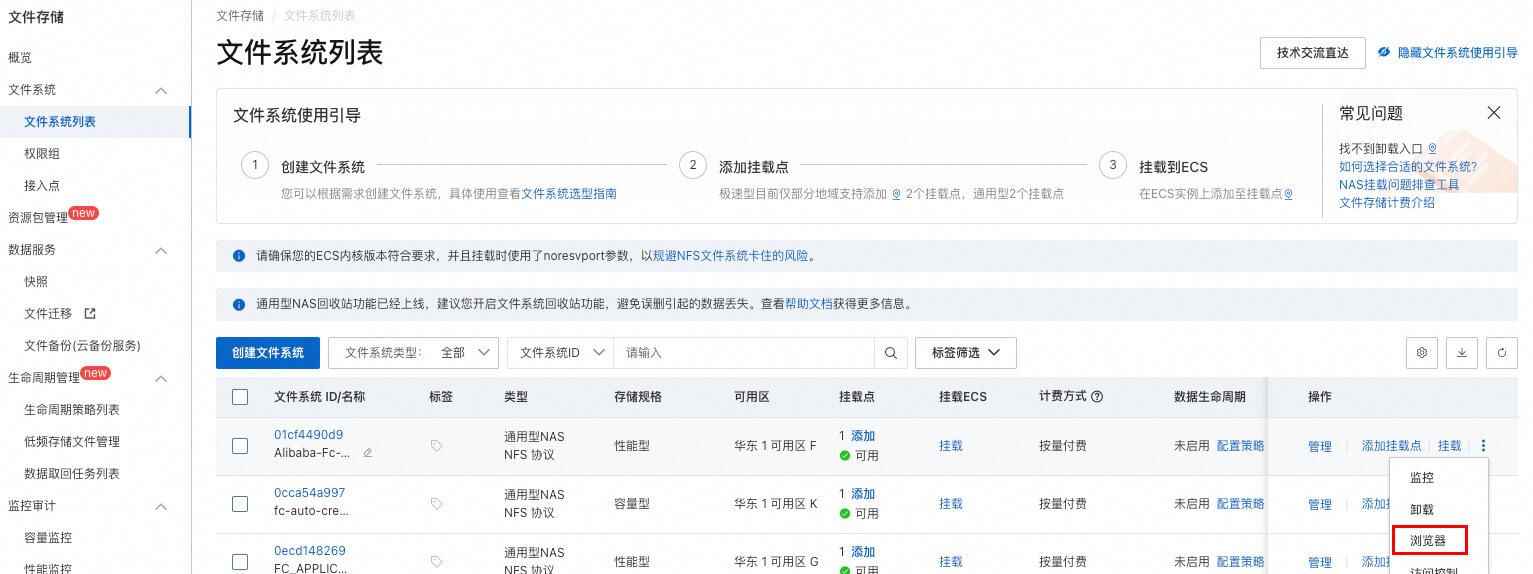 3. **NAS 挂载**:进行 NAS 挂载设置,绑定对应专有网络、交换机下存在的 NAS 挂载点。