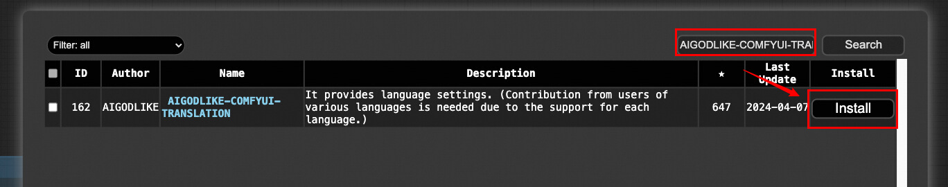 以安装中文翻译插件 [AIGODLIKE-COMFYUI-TRANSLATION](https://github.com/AIGODLIKE/AIGODLIKE-COMFYUI-TRANSLATION) 为例,使用 ComfyUI-Manager 进行安装。