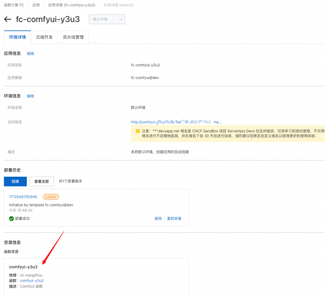 - 进入项目,并进行项目部署:`cd fc-comfyui && s deploy -y`