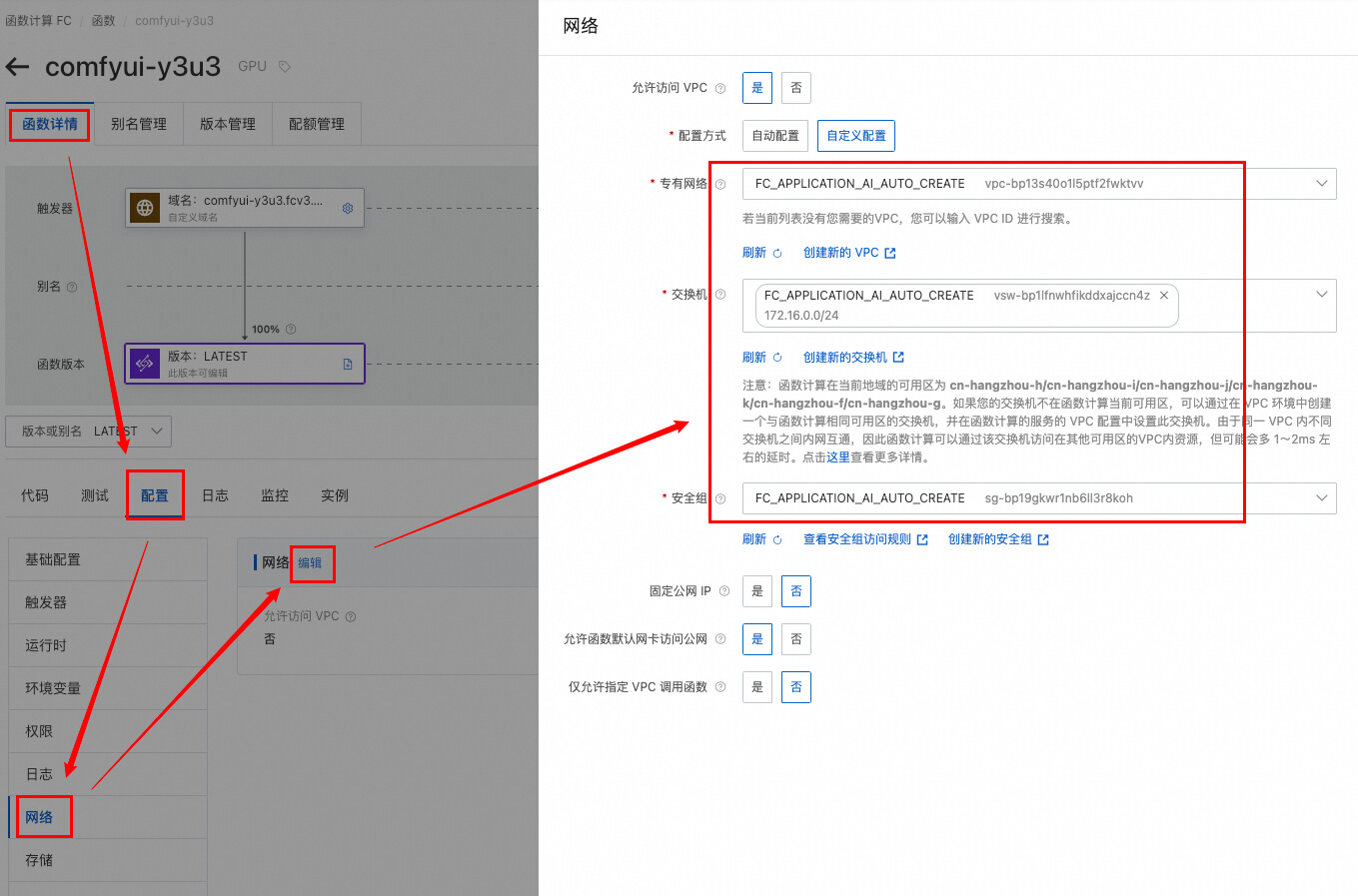 为使用自定义模型和节点,需先绑定文件管理 NAS。通过函数控制台的网络配置,绑定专有网络/交换机。若无相关资源,需先创建。
