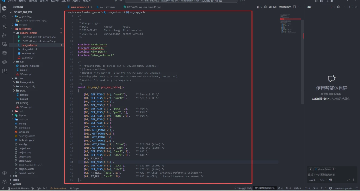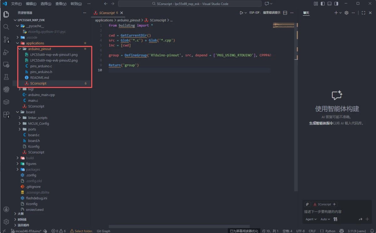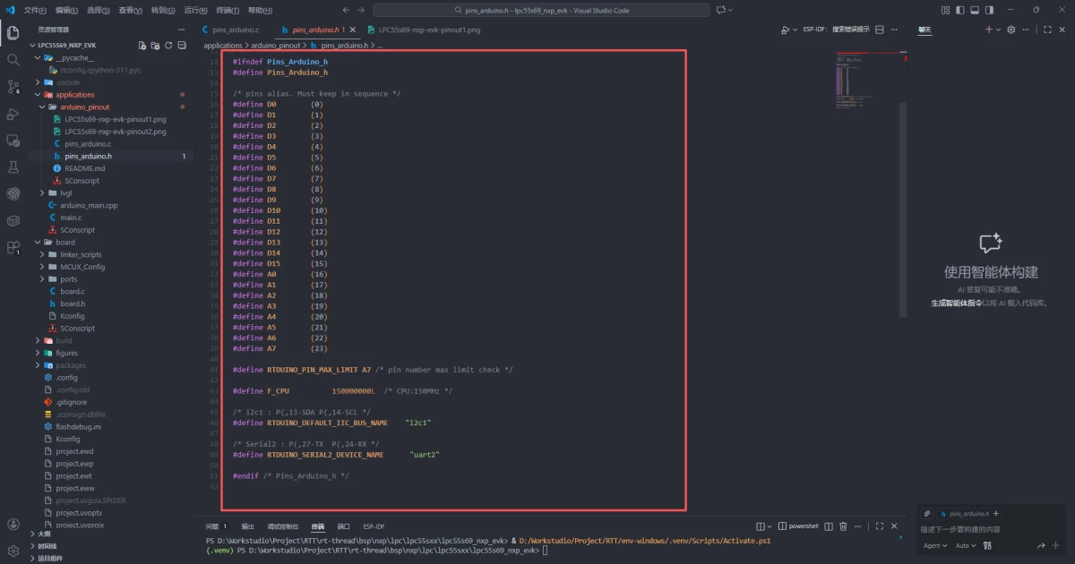 +我们来参考一下lpc55s69_nxp_evk的RTduino适配文件,进入application目录下可以看到arduino_pinout目录如下