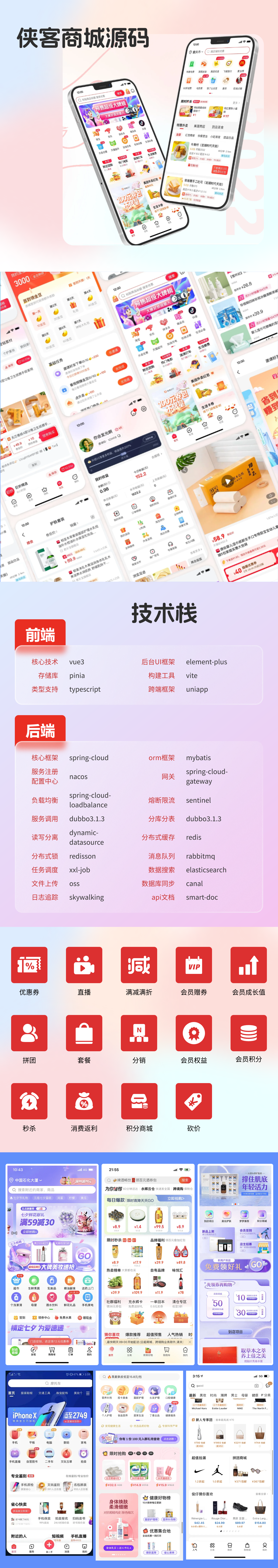 我们立志于打造强大、灵活、易用的商城系统,希望最终成为 java程序员的首选商城框架,为了让您的商城开发事半功倍,我们开源了此套商城系统。多元的商业模式满足您任何使用场景的需求,有S2B2C供应链商城、B2B2C多商户商城、O2O外卖商城、B2C单商户商城、社区团购、B2B批发商城等众多商业模式并含有限时秒杀、直播、优惠券、满减、砍价、分销、套餐、拼团、消费返利、平台抽佣、储值、同城配送、到店自提、库存、代销更有强大的DIY装修功能。